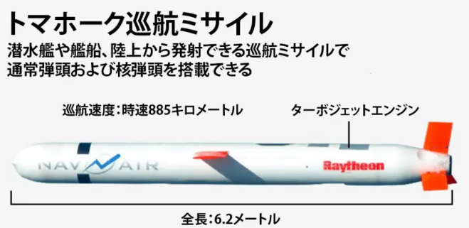 イスラエルがおよそ200機の戦闘機を投入し、米国がB2ステルス爆撃機:左やトマホーク巡航ミサイル (BGM-109 Tomahawk:最大射程距離2500Kmとも言われている)