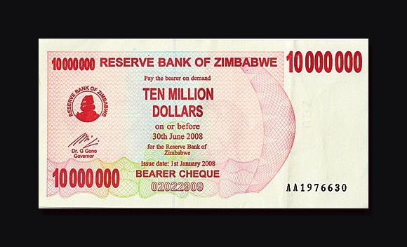 世界で最も価値の無い現行する紙幣といわれるジンバブエ紙幣。額 面、なんと1000万ジンバブエドル。闇の交換レートでは約4米ドル以下の価値しかないという。