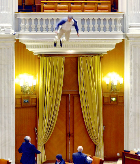 2010年12月23日、ルーマニアRomaniaの首都ブカレストBucharestで政府の財政赤字削減の目玉策として、7月に公務員給与が一律25%削減された国会で、 首相のEmil Boc氏が答弁中に国営放送の40歳の技術者が開会中の議会のバルコニーから約7メートル下の議場に飛び降りる騒ぎがあった。給与削減への抗議とみられ、男性は顔などにけがをしたが、重傷ではないという。動画ニュース 参照記事