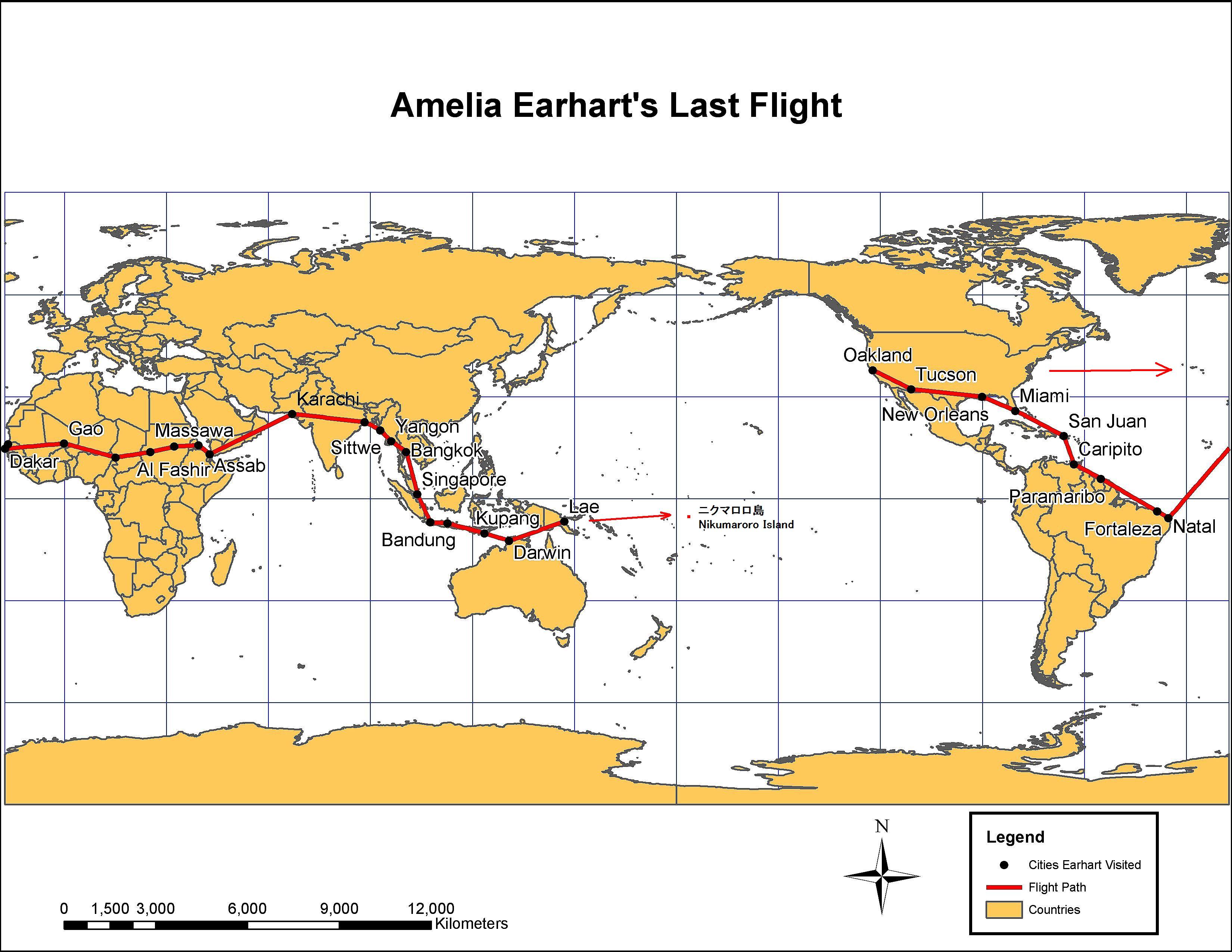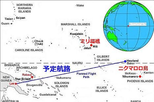 た鏡、ポケットナイフ、米国製のボトル、ジッパー、焚き火跡なども発見されており、骨片は現在オクラホマ大学Oklahoma UniversityでDNAの鑑定中で判明には約1ヶ月かかる。遺体は島に多いヤシガニなどに食べられたと見ている。右下は、地球を東に回る世界一周の飛行経路 Amelia Earhart Flight Planで、全金属製の飛行機の使用も世界初で、旅客機の座席を取り払い燃料タンクを増設し、軽量化が施されていた。無線通信機も搭載していたが、うまく機能していなかったとも言われる。左下は絶海の孤島ニクマロロ島。ウィキペディア 彼女の幼少期からの写真