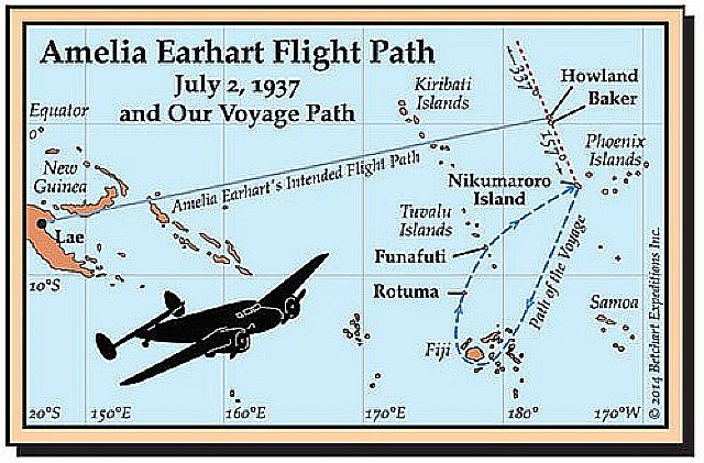 Project」と呼ばれる。6月8日にフィジー Figiを大型ヨットで出発した一行は14名で24日間かけて調査を行う。潜水用具や小さな遠隔操作できる海中探査機( a small, remotely operated vehicle :ROV) も用意している。地図は、エアハートの目的地だったHowland Island、ニクマロロ島Nikumaroro Island(左下)、及びフィジー Figiの位置。 参照記事 参照記事 参照記事