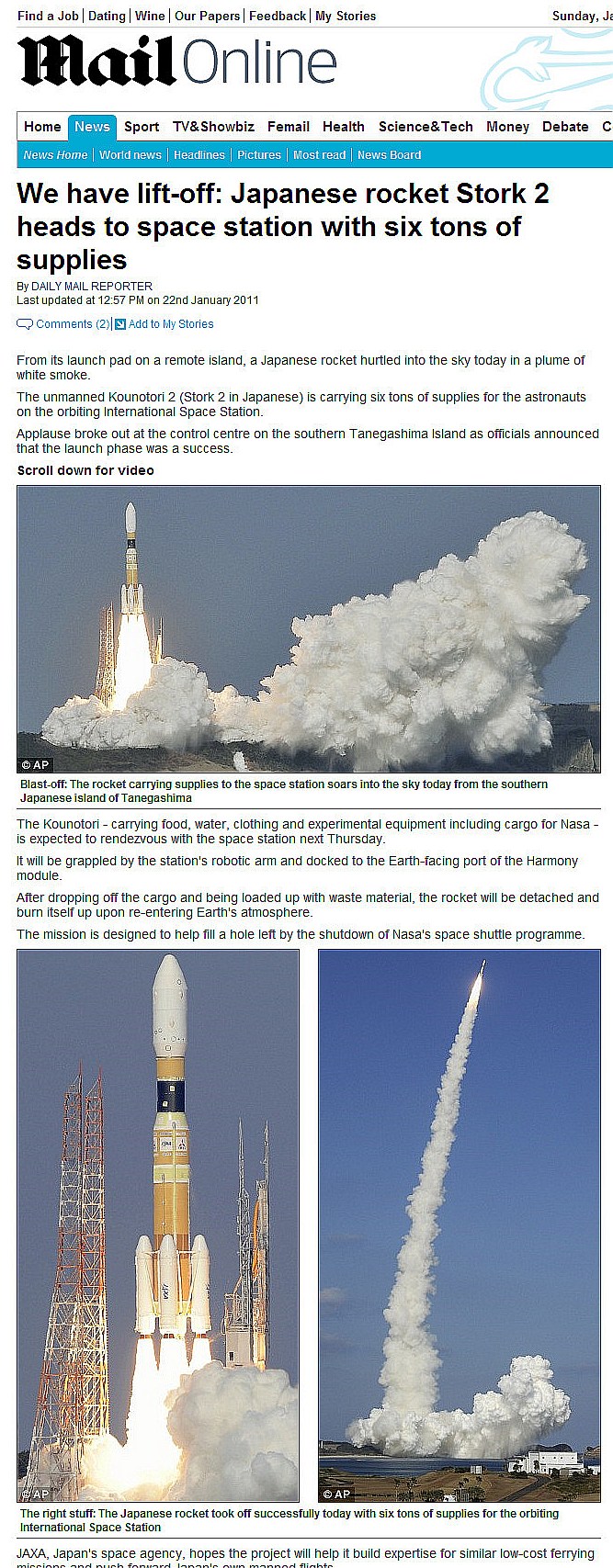 本が無人ロケットで打ち上げた事を報じている。同時に、予算削減に面しているアメリカNASAに代わって、国際的な支援がより重要になってきたとも書いてある。宇宙ではロケットをロボットアームで引き寄せ、その後宇宙基地からの廃棄物などを積んで大気圏へ戻され、再突入でロケットごと燃焼消滅する予定。英国の記事は完全に科学記事の扱いで、