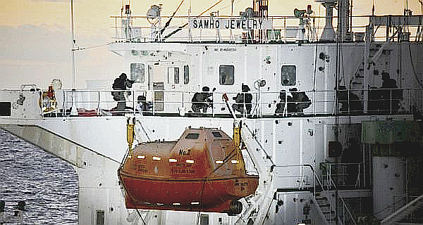 チェ・ヨン)」からの127ミリ砲艦砲射撃、ヘリコプターLynx helicopterから韓国製K6重機関銃で乗艦援護のため数百発を機銃掃射、さらに艦上の海賊をヘリから狙撃銃で射殺、海軍特殊部隊の高速ボートでの追跡、援護射撃の中夜明け前に艦上に乗り込んだ特殊戦旅団South Korean commandos(UDT/SEAL)の約20名は(写真左右)船内で AK小銃を撃つ海賊と銃撃戦となった。銃撃戦では閃光弾、催涙弾も飛び交い、海賊8人を射殺、5時間の戦闘の末タンカー船員21人(一人負傷)全員を救出した。また、海賊5人を拘束し、韓国へ送還の予定。同日現地時間14時56分作戦終了。この作戦には中東オマーン海軍の艦艇が支援した。タンカー船長は銃撃戦の際に腹部に銃弾を受けたが命に別状はない。また、特殊部隊隊員の負傷者はでなかった。韓国軍統合参謀本部のLee Sung-Ho中将は、会見を開き「この作戦は、海賊による違法活動を今後許すつもりがないという韓国政府の強い意志を示した」と語った。人質と海賊が混在した中での作戦成功は今まで例が無い。右上の写真は乗り込んだ特殊部隊の実際の状況 未明の写真の為明るめに修正済み。newsday.com