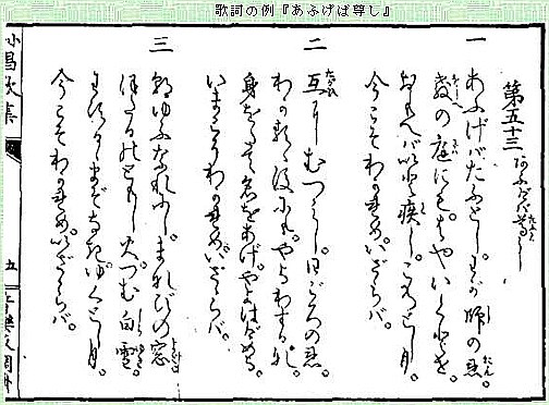 唱歌は明治時代、西洋文化を学ぶ国策の一環で作られた。文部省が明治15(1882)年から発行した 「小学唱歌集」には「蛍の光」「蝶々(ちょうちょう)」など欧米の曲に日本語詞をつけた唱歌を掲載。「あおげば尊し:旧表記、あふげばたふとし」は明治17年発行の「第3編」に載っている。元記事右上はアメリカの楽譜 Perkins-The Song Echo (1871).pdf の3ページ目、あるいはここで開く141ページ目 下は明治時代の日本語の歌詞(文部省音楽取調掛)。 仰げば尊し動画YOUTUBE