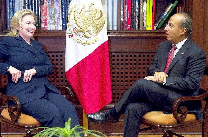 写真は1月24日、カルデロンメキシコ大統領と会談するクリントン国務長官。参照記事