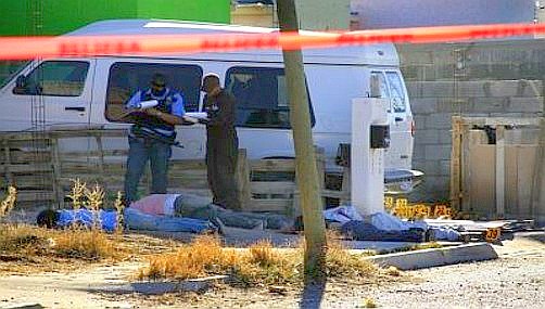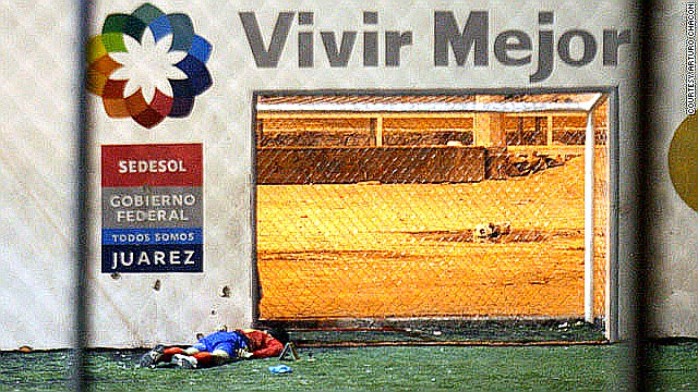 メキシコ北部米国国境沿いの犯罪都市フアレス市Ciudad Juarezで2011年1月23日6時に開かれていた地元チーム同士の サッカー試合中に、武装した集団が銃を乱射し、7人が死亡、2人が負傷した。フアレス市は3年間に7千人、最悪の昨年は3000人以上が麻薬抗争で死亡しているメキシコ最悪の流血bloodshed都市で、事件が起きた競技場は、麻薬犯罪撲滅を目指す計画の一環として4カ月前に オープンしたばかりだった。24日の時点で、犯行グループの動機は不明。 右の写真では死亡した選手が倒れている。