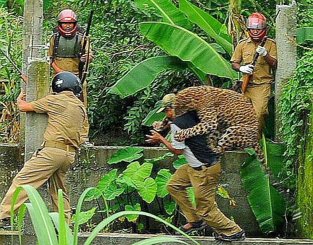 2011年7月19日インドindiaの西ベンガル州ダージリン地区にあるシリグリの郊外の村a village near Siliguri in West Bengal's Darjeeling district に野生のヒョウ leopardが出現し、村民が教われる被害だ続出し11人が怪我をした。警官と森林警備隊が出動し、廃屋に隠れているヒョウを発見。その時警備員を襲ったときの写真が右で、ヒョウは鎮静剤を打たれて取り押さえられたが、警官が襲われた際に助けるためナイ