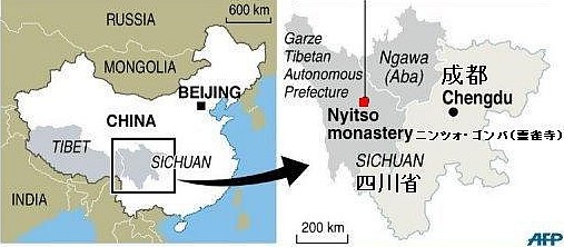 15日正午、カンゼ州タウ県にあるニンツォ・ゴンバ(霊雀寺、またはNyitso Monastery ニンツォ修道院)の僧侶ツェワン・ノルブTsewang Norbu さん(29歳:右)は県政府の前で大量のビラを撒いた後、ガソリンを被り焼身自殺を図って死亡した。目撃者の証言によると、ノルブさんはそのとき、「チベット人は自由がほしい “We Tibetan people want freedom,” 」「ダライ・ラマ万歳"Long Live the Dalai Lama"」「ダライ・ラマをチベットに帰還させて “Let the Dalai Lama return to Tibet,”」などと叫んでいた。 骸(むくろ)をさらす、君の願いが世界に届かん事を。合掌 参照記事英文 参照英文記事、、寺には約百人の 僧侶が生活しており、その出入りが禁止されており、水と電気、食品の供給が止められた。また、事件直後から現地への外国人の立ち入りも禁止された