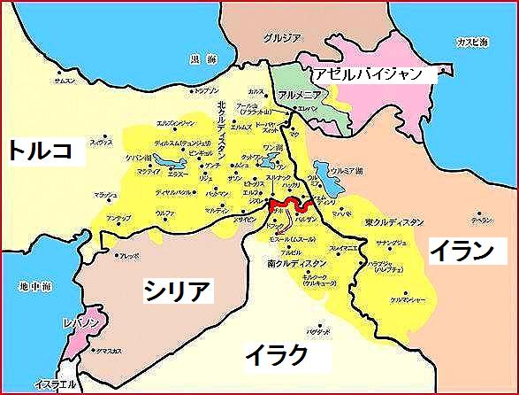 左の黄色い部分は2008年当時のクルド人分布。大きくは4カ国にまたが