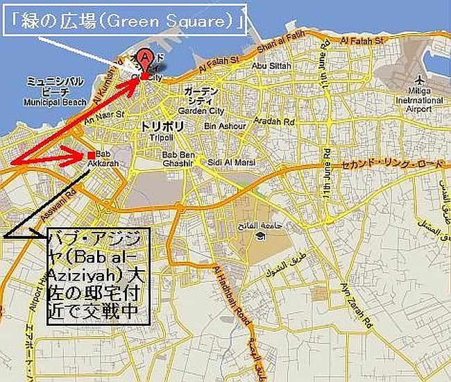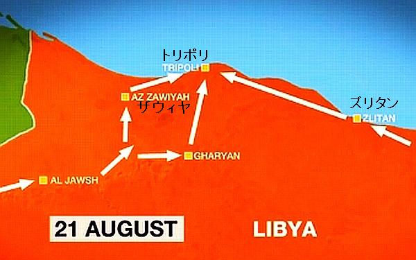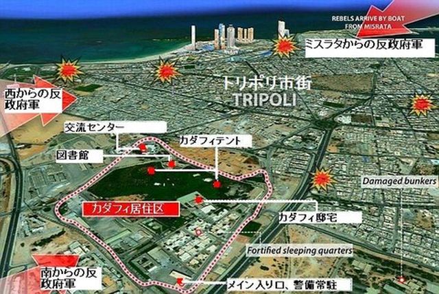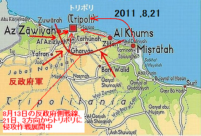 展開する可能性がある。そうなれば人的被害は相当なものになるだろう。カダフィ軍は、市内から榴弾砲、対空砲での攻撃も行っている。2011年8月22日:右は日本時間21日夕方のアルジャジーラの反政府軍侵攻図 自前での侵攻図と同じで、今までの経過から、早い時期、少なくても今月上旬には3方向からの進撃を計画していたと想像できる。今回トリポリ東部のミスラタの反政府軍は海上から、200キロ離れたトリポリに侵攻した。途中にいるカダフィ軍を避けたのだろう。 地図参照記事 最新ニュース映像