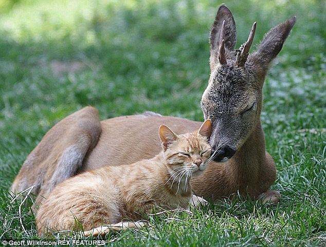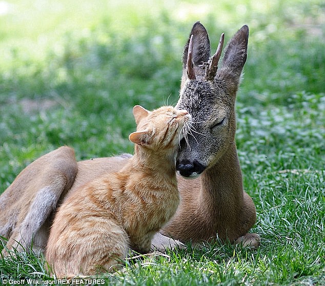 写真家のVitaly Ktachさんは、偶然目にしたその光景に一瞬困惑したが、あまりのかわいらしさに写真を撮らずにいられなかった。それは、ウクライナ(左、緑)の オデッサ動物園Odessa Zoo, Ukraineでの出来事で、まだ子供の鹿とネコが仲良く戯(たわむ)れているというもの。一緒に歩き回り、休んでいても互いに摺り寄う仲の良さです。この記事のタイトルには、当然のようなオヤジギャクが、、「あれはなんだろうね、マイ デアーWhat's that, my deer?」。 デアー:鹿(deer)とデアー:親愛なる(dear)をかけています。参照記事 それにしても、ネコと鹿さえ仲良くなれるのに、最近の世界情勢には、、