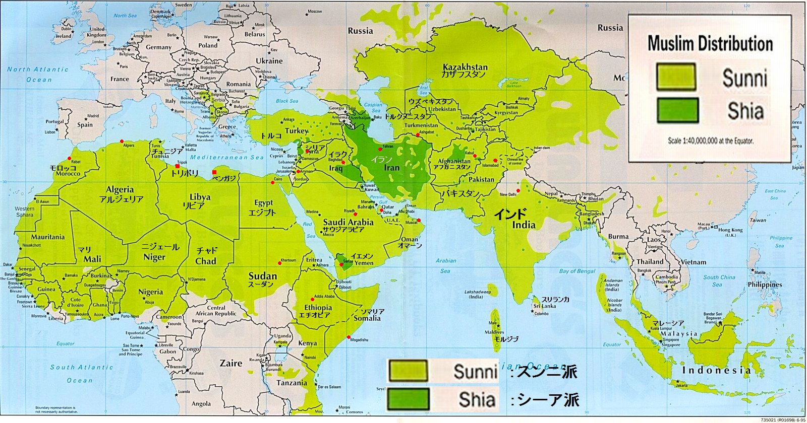 右はイスラム教スンニ派(sunni)、シーア派(shia)の分布図、クリックで拡大する。一般的には、壊滅状態のアルカイーダも反米、反ユダヤのスンニ派に分類されている。