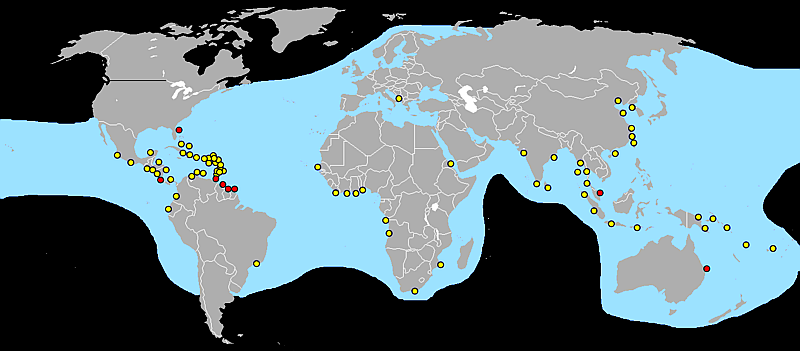 が、、、。ウミガメの中でも最大種で、最近その数が激減しているオサガメはマレー半島を産卵地にしています。主食はくらげのため、海中のビニールやプラスチックを食べるので、海洋ゴミが問題になっています。右は主なオサガメの産卵地で、赤い丸は重要な産卵場所で、アジアではマレー半島のマレーシアがその場所です。クリックで拡大