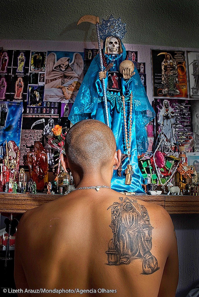そして、犯罪者にとって「サンタムエルテ」は、自分の命を敵から守ると信じられ、さらに、その願いを強くするためにより多くの敵を殺す(いけにえ)という発想にもつながっている。