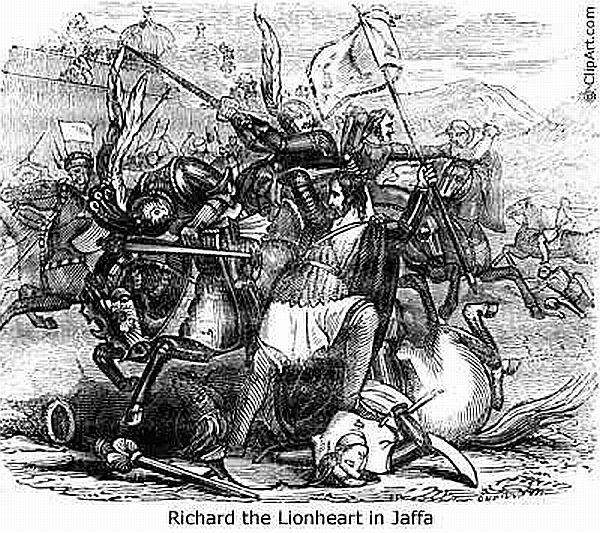 フランス王フィリップとの共闘、キプロス島攻略、キリスト教会の十字軍遠征 the Crusaders:右、スルタン(イスラム)の英雄サラディン軍Muslim leader Saladin's army:左 との死闘(1191年:第3回十字軍の戦い。相互に休戦条約締結 サラディンは1192年、現在のシリア、ダマスカスで死去)などで、彼の半生は戦いの連続だった。その勇気と生き様は騎士の模範とされ、敬意をもって獅子心王-Lion heartと称えられた。もっとも、莫大な戦費を税金として徴収したり、治世のほとんどを国外で過ごし内乱の種をまいたりと、政治家としては失格だった。
