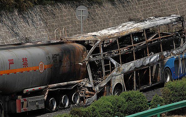 陝西省延安市の高速道路で2012年8月26日未明、サービスエリアの出口の近くで長距離バスが先を走っていた燃料輸送中のタンクローリー(停車中だったとの記事もある)に追突する事故が発生、積載していたメタノールが流出して引火し、バスが激しく炎上した。中国当局の公表では、バスの運転手を含む36人(定員39人)が死亡し、3人が負傷した。事故のバスは2階建タイプの寝台バス。25日午後5時頃、内モンゴル自治区のフフホト市を出発し、約800キロ離れた陝西 省西安市に向かっていた。現場に残されたバスのブレーキ痕は10メートルほどに達し、バスの車体前方はタンクローリーに2メートルほど押しつぶされている ことから、事故当時、バスは相当速いスピードを出していたとみられる。バスの3