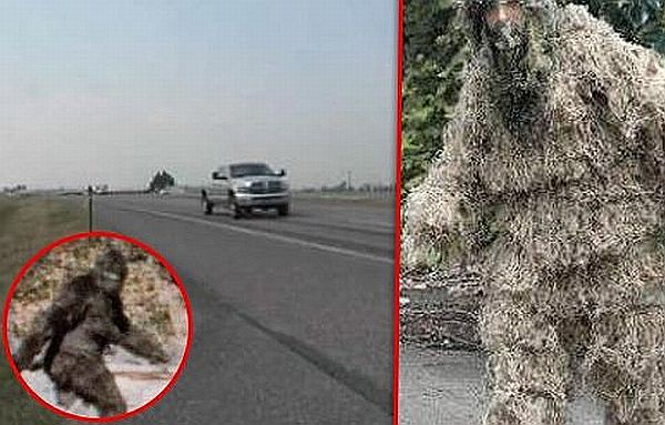 モンタナMontana州の当局者らによると、カナダに近いモンタナ州北西部、フラットヘッド湖Flathead Lake近くのハイウエー上で20121年8月26日夜10時半ころ、未確認生物「ビッグフットBigfoot、または サスカッチSasquatch」に扮装して騒ぎを起こそうと車道を歩いていた男性Randy Lee Tenley:44歳が、通行中の車にひかれて死亡した。写真はこのような変装だったと思われる参考写真と彼が轢かれた現場。道路手前の車線だった。男性は、落ち葉や草に似せた「軍用ギリースーツmilitary-style 'Ghillie suit,'狙撃兵が使用」と呼ばれる偽装服camouflage outfit 、Camo を着用し、車道を歩き出していたという。州警察によると、男性の姿は多分 非常に見えにくい状態"He probably would not have been very easy to see at all,"で、彼が酔っていた事も原因とみられる。男性は15歳の少女が運転する車にはねられ、続く車が急ハンドルを切った後、3台目の車にひかれた。3台目の運転者は17歳だった。友人らの話によると、男性は「ビ