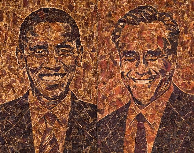 2012年9月19日:「ここに君を熱くするアートがある。Here's some art you can really sink your teeth into!」と紹介されたこの絵画。実はその素材はビーフジャーキーです。題名は「'Barack ObaMEAT' and 'MEAT Romney'バラク・オバミートとミート・ロムニー」と米国大統領バラク・オバマ(Barack Obama,)と次期大統領候補ミット・ロムニー( Mitt Romney)を文字っています。 塩気のあるビーフだけで作られている:made solely out of the salty beef treat と説明がありますが、この塩気saltyの単語には「きわどい」などの意味もあり、確かに考えようによってはきわどい作品です。何せ、個人を牛