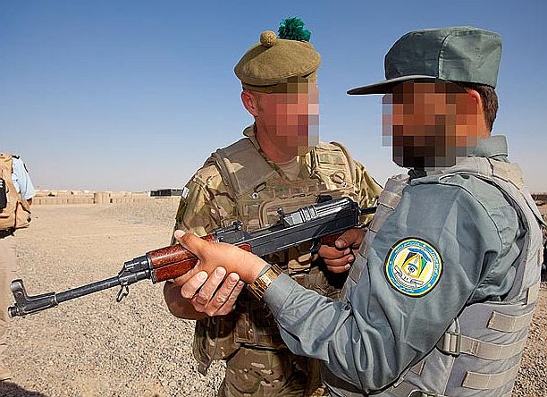 2012年8月に 「青に緑が攻撃」? アフガン という記事で、アフガンで地元採用のアフガン兵が寝返って、米軍、国際軍の兵士を殺害する事件が頻発していると書いたが、駐留英国軍でも今年に入って5人が殺害されている。写真は典型的な、英国兵が現地採用の警官を教育している様子で、この場合色で言えば、緑(カーキ)の制服が青の制服を教育しているとなる。