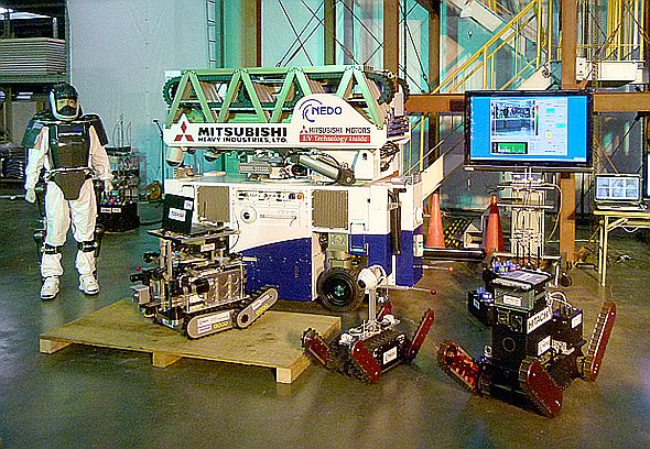 質で汚れた表面を清掃することができる。ロボットは自動制御で5時間(リチウム電池使用::三菱自動車工業のEV(電気自動車)用バッテリ技術を本ロボット用にカスタマイズ)働くことができるほか、操作も遠隔で行える。三菱重工は新ロボットについて、福島第1原発の事故処理作業に最適と指摘している。参照資料 英文資料もはやロボットでしか作業できない原発が、多様なロボットの開発を促進した。素直に「日本の技術はすごい」とは言えないような気がするが、、。参考資料