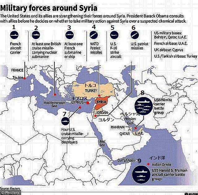米軍空母はシリアを空爆できる範囲内にいる。 ロシアのインターネット記事では、 地中海の東部には既にトマホークミサイルを積んだ米海軍の駆逐艦が4隻展開している。そして英国の戦艦・潜水艦が。アドリア海には英国のヘリ搭載艦、ま た2隻のフリーゲート艦が控えている。紅海およびペルシャ湾には米国の空母グループが構えを作っている。そしてフランスはシリア沿岸に最新式フリーゲート 艦を近寄せていると書いている。参照記事 参照記事