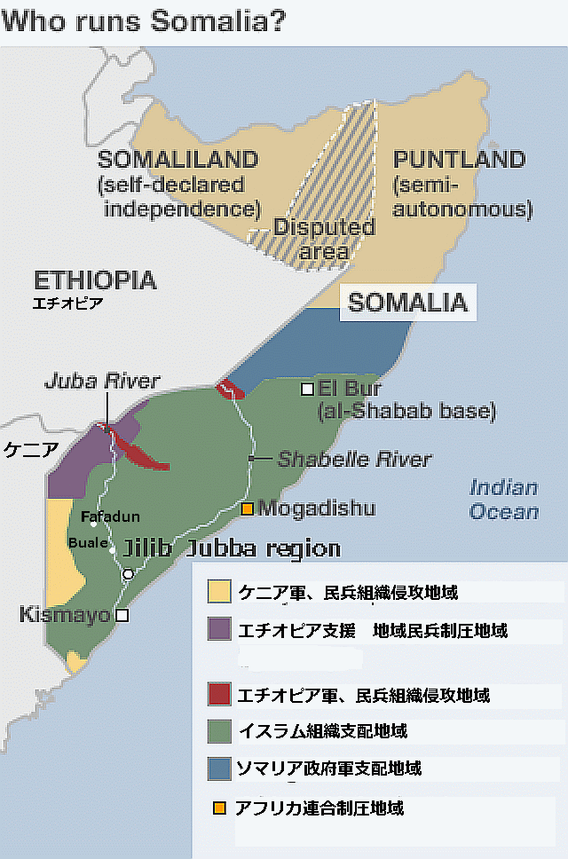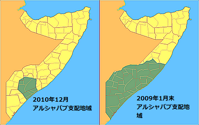 治政府を樹立しようとしたことから今に至っている。右下は、アルシャバブの支配地域の変遷で、現在は2010年よりさらに狭い中部ジュバ州Middle Jubba周辺に孤立していると思われる。参照記事