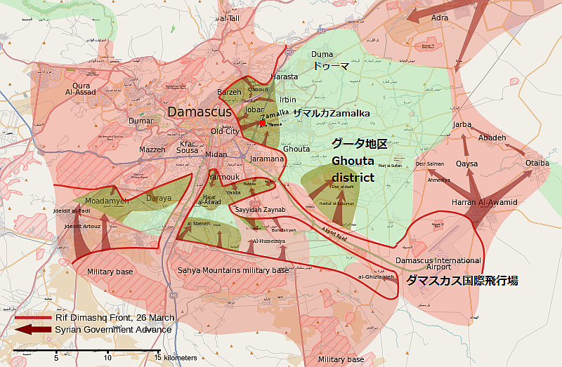 これで重要なガスパイプラインがどこを通っているか反政府側の知ることになり、またイラン等から物資の補給にも使われている飛行場が制圧されれば、ダマスカスのライフラインは致命的な影響を受けるだろう。拡大地図は2013年10月9日時点とされるダマスカス周辺のもので、赤線が前線、ピンク部分が政府側支配で、青い部分の反政府側が包囲されている状況がわかる、緑色は交戦中 赤い矢印が政府軍の攻撃方向 現在は反政府側地域がさらに縮小気味と思われる。 参照記事 Syria Army kill 40 militants and capture weapons in Ghouta 地図のダマスカス近郊右のZamalkaでの10月2日投稿の記録映像 北部ホムスに通じる高速道路沿いにあり、シリア軍が10月上旬に制圧したといわれているが、ダマスカス中心部まで5キロ程の地点で、毒ガス被害のあった地域。 参照英文記事 過去ブログ:2013年10月PKK トルコに再度宣戦布告か?トルコ ダマスカス市内へ毒ガス被害地区からロケット砲攻撃 シリア