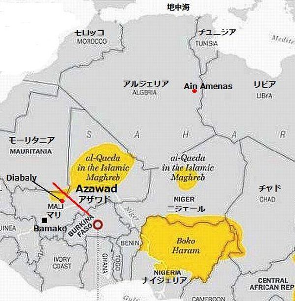 施設で拉致された。オランド氏に近い筋によると、4人の健康状態は良好で、フランスのルドリアン国防相によると、武力の行使も身代金の支払いもなかったという。4人と同時に拉致されていた、ラリブさんの妻とトーゴ人1人、マダガスカル人1人の3人は、2011年2月に解放されていた。 2011年11月にマリ北部のトンブクトゥ(Timbuktu)で拉致されたオランダ人、スウェーデン人、南アフリカ人の消息は以前不明。地図の黄色はイスラム過激派活動地域 過去ブログ:2013年4月アフリカの混乱 仏人家族誘拐>釈放 アフリカの麻薬等 2013年3月イスラム組織司令官死亡か マリ ニジェール 2013年1月政府軍北進続く マリ 2012年7月サハラ砂漠の新国家「Azawad」>国際紛争化 マリ