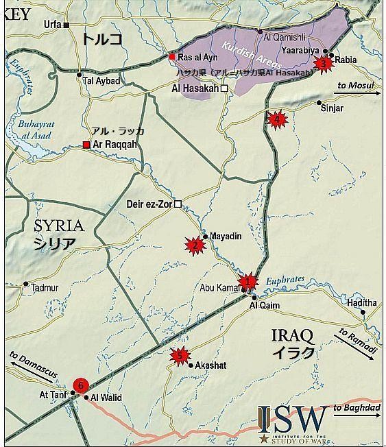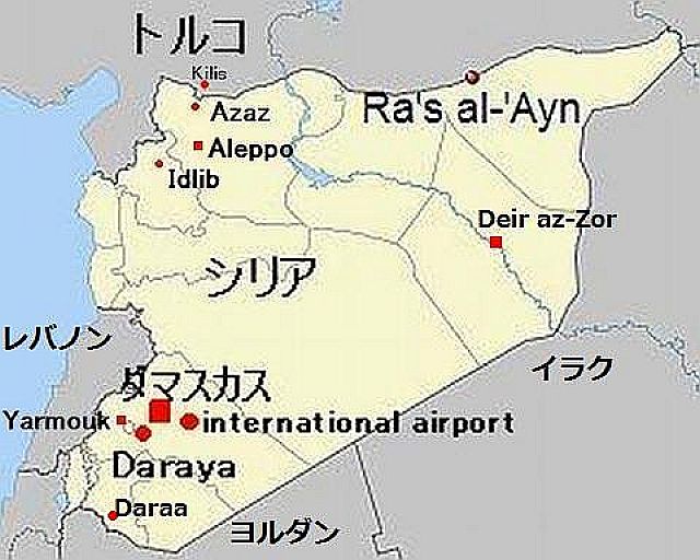 このルートは、イスラム勢力が物資の補給路に使用していたといわれるが、場所はクルド人が独立を目指すハサカ県(アル=ハサカ県Al Hasakah:地図の紫色 カミシュリQamishliががクルド人の拠点都市)東部にある。すでに隣国トルコとの緊張関係にあるクルド人は、2012年8月頃から反政府派イスラム系との戦闘が本格化しており、10月16日の報道では、ハサカで40人の死者の出る衝突があり、また反政府勢力内部では最近、アレッポ Aleppoなどで自由シリア軍とイスラム勢力などの内部衝突が多発していると報じられている。左の赤い点は主な攻防地点 9月から激しい戦闘のあった南部Daraa県のTafasチェックポイントを、10月26日反政府側が制圧したと報じている。映像 ホムス Homs、ダマスカス東部、南部の戦闘が激化する中、10月27日、19の組織からなる反政府側は11月23日予定の第2回ジュネーブ和平協議 Geneva II conferenceへの参加拒否の声明を出している。国連により化学兵器の査察は進行中で、シリア側はすでに過去のグータ地区での毒ガス使用を認めているが、現在シリア軍は、今まで以上の空爆を展開し、アレッポでは小学校が空爆されている。国連査察は、戦闘の鎮静化には全く影響力を出さず、査察以上の西側の介入が無い状況下で、シリア側の攻撃は無差別で残酷でさえあり、やり放題にさえなっている。 参照記事 参照記事 参照記事 参照記事 過去ブログ:2013年10月PKK トルコに再度宣戦布告か?トルコ 8月クルドとイスラム組織対立が深まる可能性 シリア