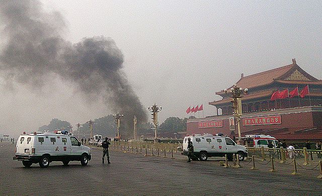 中国・北京市の天安門広場Tiananmen Squareで2013年10月28日午後12時5分ころ、新疆ウイグル地区のライセンスを付けたXinjiang licenseジープjeepタイプの車が歩道に突っ込んで炎上し、観光客ら5人が死亡し、日本人男性を含む38人が負傷した。目撃によれば、車は警笛を鳴らしながら約500メートル程走行し、観光客や警官らを次々とはねたあと、紫禁城(Forbidden City/ Forbidden Palace)外の金水橋(Jinshui Bridge、Golden Water Bridge )の白い大理石製の欄干guardrail に衝突、炎上した。写真は、事件直後の様子。映像記録
