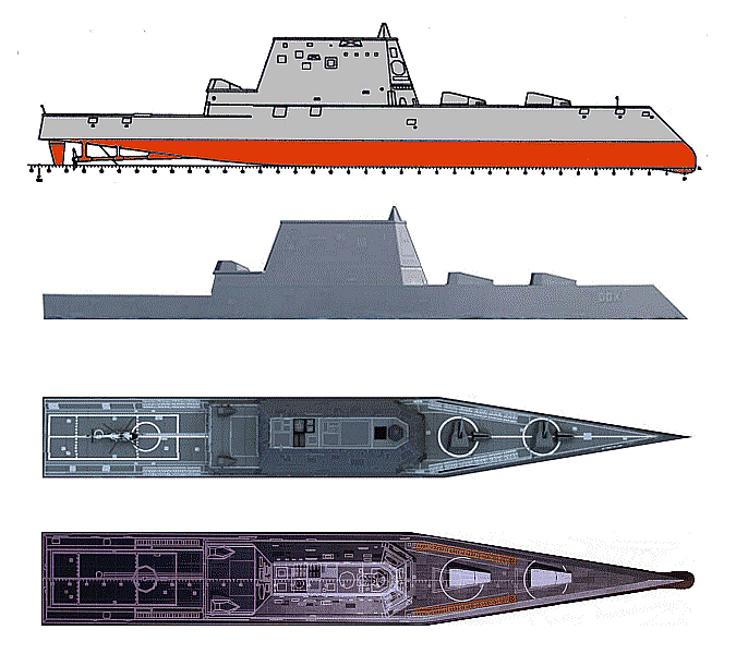 と紹介されていた駆逐艦 DDG-1000の全容が見えてきた。総工費40億ドル(約4000億円$4 billion)で、全長約189m;610 feet longが、5年の歳月を経てアメリカ合衆国北東部のメインMaine州ケネベック川;Kennebec Riverに10月28日その姿を現した。レーダー探知されにくいステルスstealth性能を上げるため、独特な形状をしている。乗員は130名で、艦内の環境も格段に向上している。DDG-1000は2015年秋に配備予定で、その後更に、30mほど長いが乗員数が少なくて航行できるDDG-1001, USS Michael Monsoorが2016年、DDG-1002, USS Lyndon B. Johnsonが2018年就航予定とされている。参照記事
