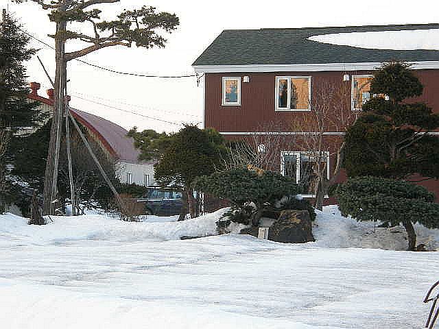 2014年3月24日も定刻に出勤してきた1号、2階の窓から見ると、例の松の木の上で自分の現れるのを待っている。今日は一度その前を車で通り過ぎ、彼を正面から撮ってみた。座り心地がいいのか、周りを見るには良い高さなのか、お気に入りの場所らしい。雪山はこの左にある。