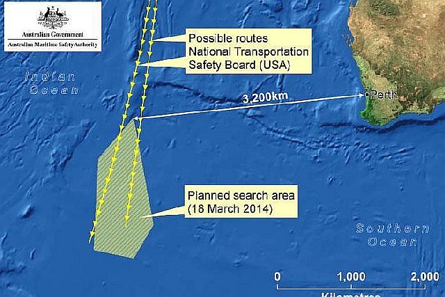 メトロ紙の記事によれば、南北に長いモルジブの南部Dhaalu Atoll(ダールサンゴ礁)に北から現れた不明機は、最南端のAddu方面、南東方向へ飛び去ったと説明されている。これを地図で検証すると、東のマレーシアから飛来した不明機は、モルジブ辺で進路を南にとり、赤道方面に飛行したことになる。あくまでも筆者独自の、記事の目撃談からと地図上の判断ですが、、。その先には、現在オーストラリアが捜索しているオーストリア西方海域がある。マレーシア政府は、370便が南下した事を知った上でオーストラリアへ大陸西方海域の捜索を依頼したと思えるのだが、、。下が現在オーストラリアが捜索している海域で、上記の説明で、いきなりこの遠隔区域が捜索範囲になった説明がつくが、モルジブからの情報はあくまでも目撃証言で、科学的な根拠はない。しかし、18日の報道では、米国がオーストリア西方海域への空からの捜索にP-