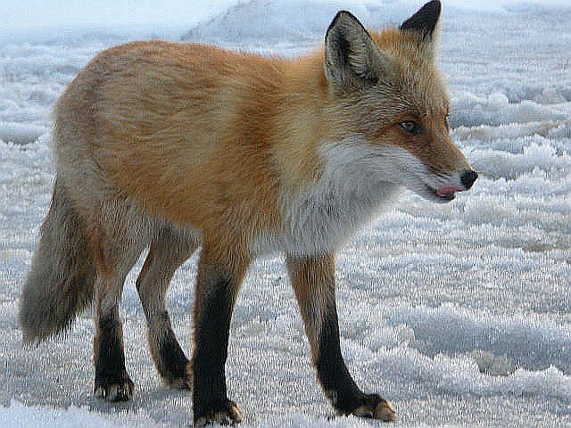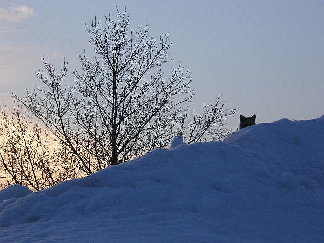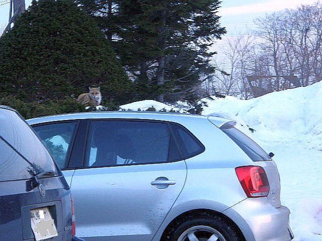 ここまで書いて外に出かけた。すると一匹が現れた。雪山の上にも1匹がいる。どちらもそっくりで、見分けがつかない。尻尾も二匹ともしっかりふさふさしている。