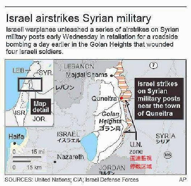 イスラエル軍は2014年3月18日に、イスラエルが占領するゴラン高原 Golan Heightsのイスラエル側停戦ライン ceasefire lineで、不審な動きを察知して警戒中の軍車両が路上爆弾攻撃に遭い、兵士4人が負傷した。この12時間後の翌日の19日未明、イスラエル軍は、ゴラン高原のシリア側クネイトラQuneitra(Al Qunaytirah:国連監視の非武装地帯:兵力引き離し地帯:に位置する)に近いシリア軍施設などを標的に報復の空爆を実施。この後、砲撃も加えた。攻撃は、シリア軍の訓練所、司令所、砲兵部隊に行われた。(非常に分かりづらい位置のため、地図は二つ掲載 シリア領内のイスラエル占領地区ともいえる位置にある この地域の、日本の自衛隊を含む国連平和維持軍は、紛争に巻き込まれる危険があるとしてすでに撤退している 右の地図は、イスラエル占領区域も含め、ゴラン高原をシリア領としている。)