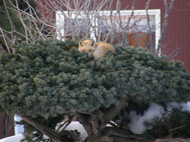 日が変わって今日は25日、4時半に窓から見ると、コンちゃんはまた松の木の上で寝ている。残飯をやるには早すぎる。残飯を狙うカラスがねぐらに帰る日没近くまで、寝ながら待ってもらうしかない。どうやら、コンちゃんもそれを知っているようだ。まだ1時間ほどある。