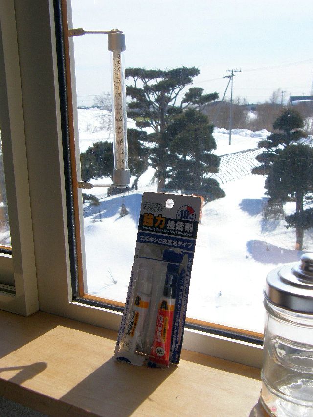 瞬間接着剤は、一度使うと硬化してほとんどダメになるが、これだと、混ぜない限り液体が長持ちするので経済的だ。金属、ガラス、タイル、プラスチックにはこれが一番良いと思っている。塗る際は片面でOK。温度計の向きは、固定してから回転させて変更できる。木部への取り付けにも、接着剤は使ったほうがいいだろう。釘の頭に塗ればサビ止めにもなる。
