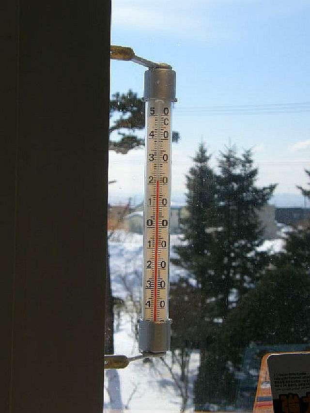 度でした)。夜間の気温だけを見るならどこでもよいが、水銀に日光が当たるところはカバーされているとはいえ、直射日光を受けると正確な外気温ではないので、なるべく日影に設置が良いと思う。自分の場合は、南向きに付けたので、温度計の上下の部分に、日光を反射させる為にステンレステープを巻きつけました。頂いてから早くつけたかったが、外がマイナス温度では付きが悪いと判断してのびのびになっていた。北欧ではどこでも見る温度計で、景色より、懐かしくこの温度計を眺めている。家の中が暖かい北欧では、外出前にこれで外の寒さを確認する。マイナス気温はー45度まで確認できる。さすがフィンランド製です。