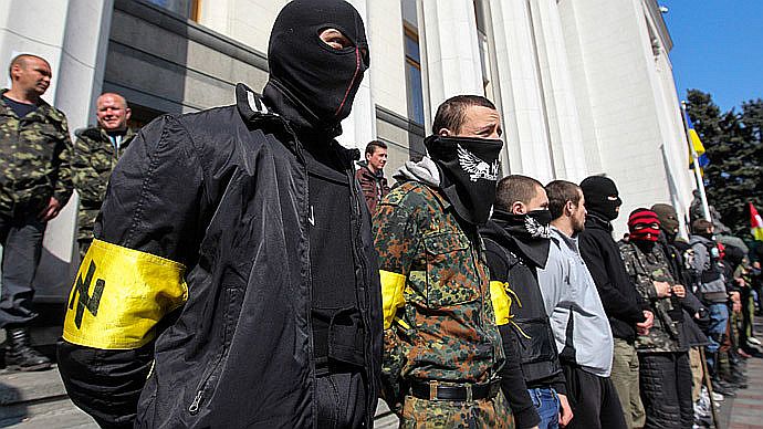 ていることに、米大統領の注意を向けた。ウクライナのキエフでは、過激な民族主義組織「右派セクターRight Sector」が国会を包囲している状態が続いている。彼らの腕章にはナチスを思わせる鍵十字が見えている。参照記事