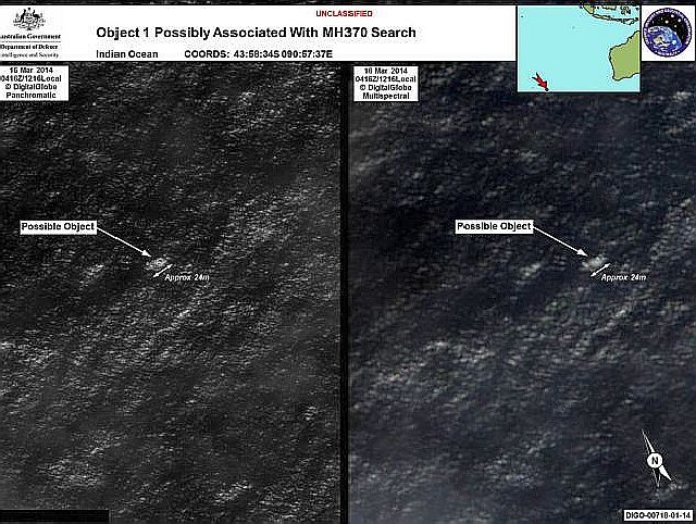 2014年3月20日:アボット・オーストラリア首相Australian Prime Minister Tony Abbottは20日、 行方不明のマレーシア機と関連している可能性がある物体二つを衛星が発見したと述べ、確認作業を急いでいる。一つは長さ24mあり、もう一つはそれより小さいもの。オーストラリア西部海岸のパース Perthから西へ約2500キロの海上 参照記事右は 公開された海上の物体の写真