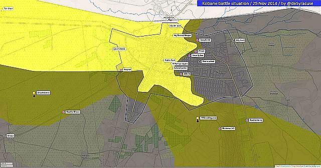 11月25日のクルド側の報道では、戦闘の続くコバーネKobaneは図のようにクルド側が西側約半分を制圧し、ISは防御に回っているとされる。映像では、クルド側が押収したISの武器弾薬が公開され、ISが武器を放棄して敗退していることを匂わせる。ラッカ以南の地域には油田が多く、この地域ではISが依然として支配を維持し、デリゾールDeir Ezzor では、恐らく不貞を問われた女性2名や、ゲイだと断定された男性2名が石打刑で処刑されたと報じられた。アレッポ北部や北西部、イドリブでは、シリア政府軍側とヌスラ戦線を含む反政府側との激しい戦闘が継続中。