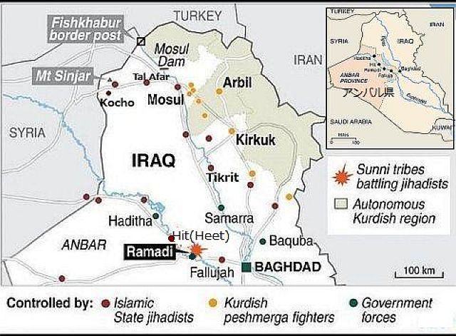 イラク軍は、ISがほとんどを制圧するアンバル県Anbar provincialの中で、政府軍が首都ラマーディRamadi(2004年の人口約48万人、スンニ派が多い.飛行場Ramadi Airportや軍事基地がある)でISの猛烈な攻撃を受け、2014年11月21日より激しい戦闘状態に入り、IS兵士8人、イラク兵士20人の犠牲を出し、戦闘は22日も市内で継続中と報告された。政府軍は現在、空爆支援を要請している。MAPISの突然の攻撃は組織的で、市の4方から同時に砲撃を交えて発生し、ISに包囲された市内では、ISに占拠された市内のモスクから「“Takbir” (God is great)」の声が拡声器で響き渡っていると報告されている。首都バグダッドまでは90~130キロの地点で、戦略上双方に重要な地点で、ISのラマーディ完全制圧の攻勢に対し、政府軍シーア派民兵が優勢と報じられているが、詳細は不明。22日の記事では、ISが市をほぼ掌握したとも言われる。ISは、地元の部族民兵に、ISに抵抗するふりをしてイラク政府から武器を得るように強制しているとも言われ、このことが政府系民兵の怒りを買っているようだ。ISが、従わない部族民兵を殺害しているとの報道もあり、また、政府系シーア派民兵が、スンニ派部族民兵を殺戮しているとも言われる。11月2日の報道では、イラク軍はHit(Heet)から敗退している。 参照記事 過去ブログ:2014年11月IS イラク北部の地上補給ルート失うか イラク 激化する米軍空爆と支援強化でIS脱走兵が増加 イラク