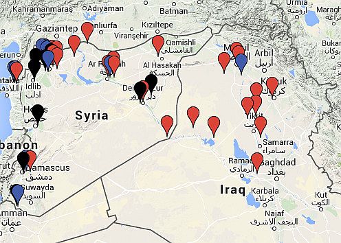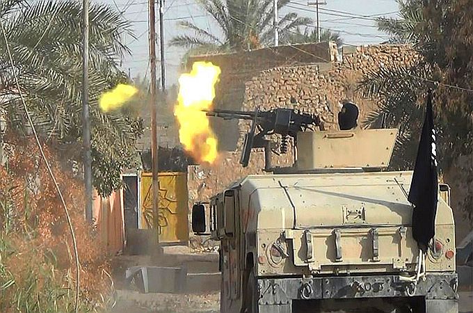 イラク軍は2014年1月以来、アンバル県を中心に、シリア、サウジアラビア、ヨルダン国境周辺、及び首都バグダッド周辺の地域で治安を維持できない状態が続いているが、最近これらの地域で、シーア派民兵、政府支持のスンニ派部族とISとの戦闘が多発している。写真はISの装甲車両 下右の地図は、最近公開されたイスラム組織の軍事キャンプの位置で、赤がIS、黒がヌスラ戦線、青がその他のイスラム組織とされている。すでに未使用の基地もあり、イラク最南部のキャンプはファルージャFallūja近郊とされ、2014年10月23日に空爆されたと記録されている。Terrorists training camps in Iraq and Syria:軍事キャンプ地図 参照記事 参照記事