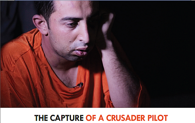 「イスラム国」はインターネット上にアップした英字機関誌「ダビク(ダービク):Dabiq」に4ぺージを割いて、F-16戦闘機で作戦行動中の2014年12月24日に撃墜され、人質となっているヨルダン人パイロット・モアズ・カサスベ中尉 Muath al-Kassasbehへの尋問の様子を掲載している。(PDF記事の34ページより英文)その中でカサスベ中尉は、不明だった墜落の原因を、熱追尾型ミサイル a heat-seeking missileに撃墜され、パラシュートで脱出し捕獲されたと語っている。この中で各国の飛行ミッション(指令)は、カタールQatarにある米軍基地で米軍が得た情報から攻撃目標が決められ、各参加国へ飛行前日には出され、彼は離陸するヨルダン内の基地Muwaffaq al-Salti Air Base(Al-Azraq Air Base)で、そこに勤務する米国人から地図として指令が渡されたと語っている。基地には、メンテナンス要員やパイロットら約200人の米国人が勤務していた。最後に彼は「ISが囚人をどうするか知っているか」と聞かれ「知っている。自分を殺すだろう」と答えている。ひげの具合から、この後もしばらく生存していることは間違いないだろう。
