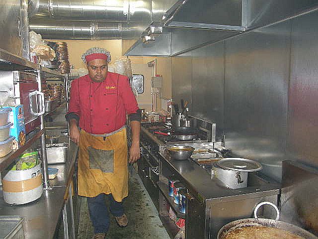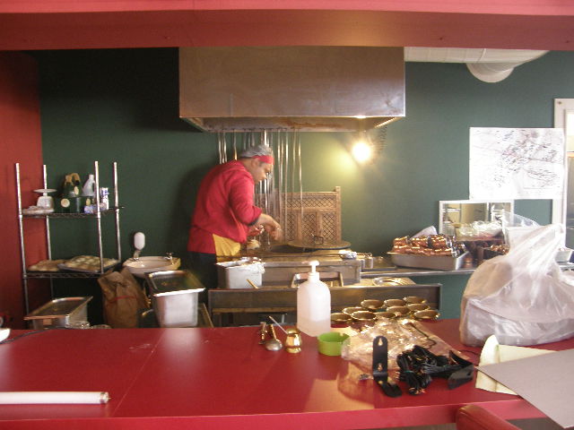 なんとか厨房から先に完成し、写真ではコックさんが厨房の段取りをしている様子と、下は、工事中の店内の片隅で、開店準備にパソコンとにらめっこのマネジャーのカマルさん。インド料理に欠かせないナンは、カウンター越しに見える窯で焼いている。窯の中には炭が入っていて、着火時は煙がでる。このための排気が難しい。排熱のカロリー計算だけでは、炭火が安定した場合の排気量が多すぎて、店内が寒くなる。結果的に焼いたナンが冷めてしまう。