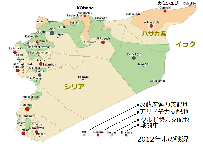 シリア北部への侵攻を警戒して立ち上がったYPGの民兵たち。始まりはハサカ県カミシュリQamishli、Al-Hasakah Districの、シリア政府軍、イスラム反政府勢力からの防衛だった。左の2012年末の地図ではまだコバーネへの脅威は起きていなかった。緑色が、反シリア政府勢力の分布を示している。コバーネKobaneへのISの攻撃が激化するのは、2014年9月で、戦闘期間は131日(または133日)だったと報道されている。過去ブログ:2014年9月シリア北部でのIS侵攻にクルド側攻撃激化する シリア 2013年4月シリアの新たな局面 クルド人蜂起か? シリア 6月クルド人組織PKK、イラク北部に集結進む シリア