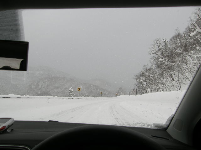右は、視界がいい時の車内からの写真と、さすがにアイスバーンと雪道運転に疲れ、山の中のチェーン装着上で一服している時の写真。愛車の向こうは降雪で真っ白だが、これから抜ける山がそびえている。山に入ると視界0に近い大雪で、どこが道路かさえかもわからなかった。工事でも店舗工事は一般的な内外装工事のほかに、厨房機器設置、給排水、空調、電気工事、防水工事と、工事量は少ないが工事種別が多く、これらを順序良く段取りするのは経験しかない。後先を間違うとそこで工事はストップする。さらに検査のための完了日が決まっているので、無理やりにでも決めたその日の工事は終えなければならづ、精神的にも非常に負担が大きい。