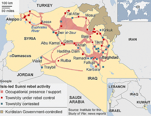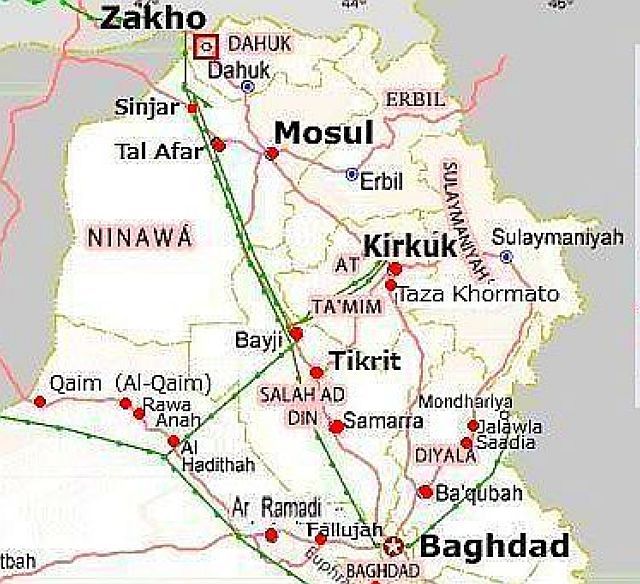 バグダッド近郊では、サマッラSamarra、ファルージャFallujahでISの攻撃が確認されているが、イラク軍が撃退したとの報道もある。キルクークKirkukは現在クルド側の制圧下にあり、周辺での軍事衝突はあるが、市への経路をすべて制圧したと1月4日クルド側が報じ、西部からの難民もキルクークの難民キャンプへ収容されている。すでにキルクークからの石油パイプでのトルコ側への送油が開始されているので、経路上の地域、及びタルアファルTal AfarからはISは敗退していると推測でき、空爆ではモー