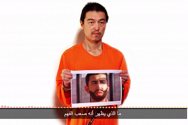 2015年1月28日:イスラム過激派「イラク・シリア・イスラム国(IS、ISIS)」の人質となっているフリージャーナリスト、後藤健二さん(47)とみられる新たな画像が日本時間の27日深夜、インターネット上で公開された。後藤さんを名乗る音声は、24時間の期限を伝えている。オレンジ色の服を着た姿で、ISISが拘束しているヨルダン軍パイロット、モアズ・カサスベ中尉 Muath al-Kassasbehとみられる写真を掲げている。音声は「彼女:サジダ・リシャウィSajida Rishwai と私という一対一の交換だ」と述べる一方、ヨルダン政府による対応の遅れはカサスベさんと後藤さんの死を意味するとして、「私に残された命は24時間しかない。パイロットの命はさらに短い」と訴えた。参照記事
