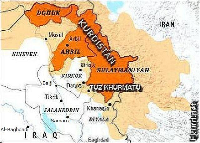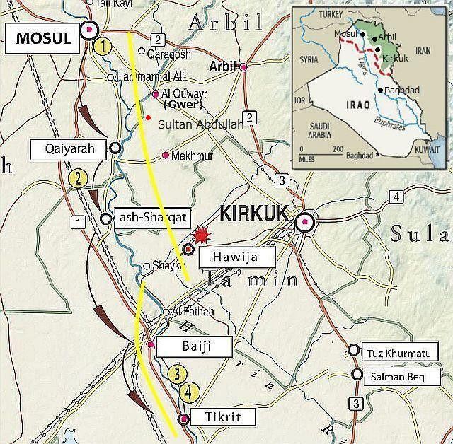 2015年3月1日:北部では、ISは繰り返しキルクークKirkuk方面のSultan Abdulla、Mahkmourへ攻撃を仕掛けでいるが、ぺシュメルガPeshmergaがこれを撃退している。Sultan Abdulla地域には3月1日、早朝4時と5時の2回の攻撃があったと報告されている。キルクーク周辺数か所では、シーア派民兵約400人が重火器の使用法や抗戦戦術、地雷の撤去などの訓練を受けているとされ、恐らくモースル方面への陸戦隊となるだろう。Sultan Abdulla、Mahkmourの北東には、キルクークからモースルへ北西に延びる直線道路があり、ISはこれを見下ろす丘か、道路上に陣地を構築したいのではと地形図から想像している。黄色いラインは、筆者が記入した、ぺシュメルガPeshmergaの想定する戦線と思われるライン 今後モースルへの攻撃には、バグダッドからの近さからも、キルクークが重要な兵站基地になる可能性がある。 参照記事